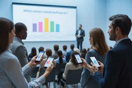Starten Sie Abstimmungen mit einem Klick und sehen Sie Ergebnisse in Echtzeit. Ihr Publikum stimmt per Smartphone, Tablet oder Laptop ab – keine App-Installation nötig.